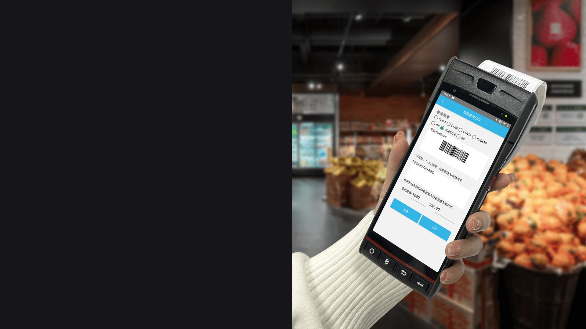 内置高速不干胶PDA打印机,无需油墨,随时随地的打印订单。