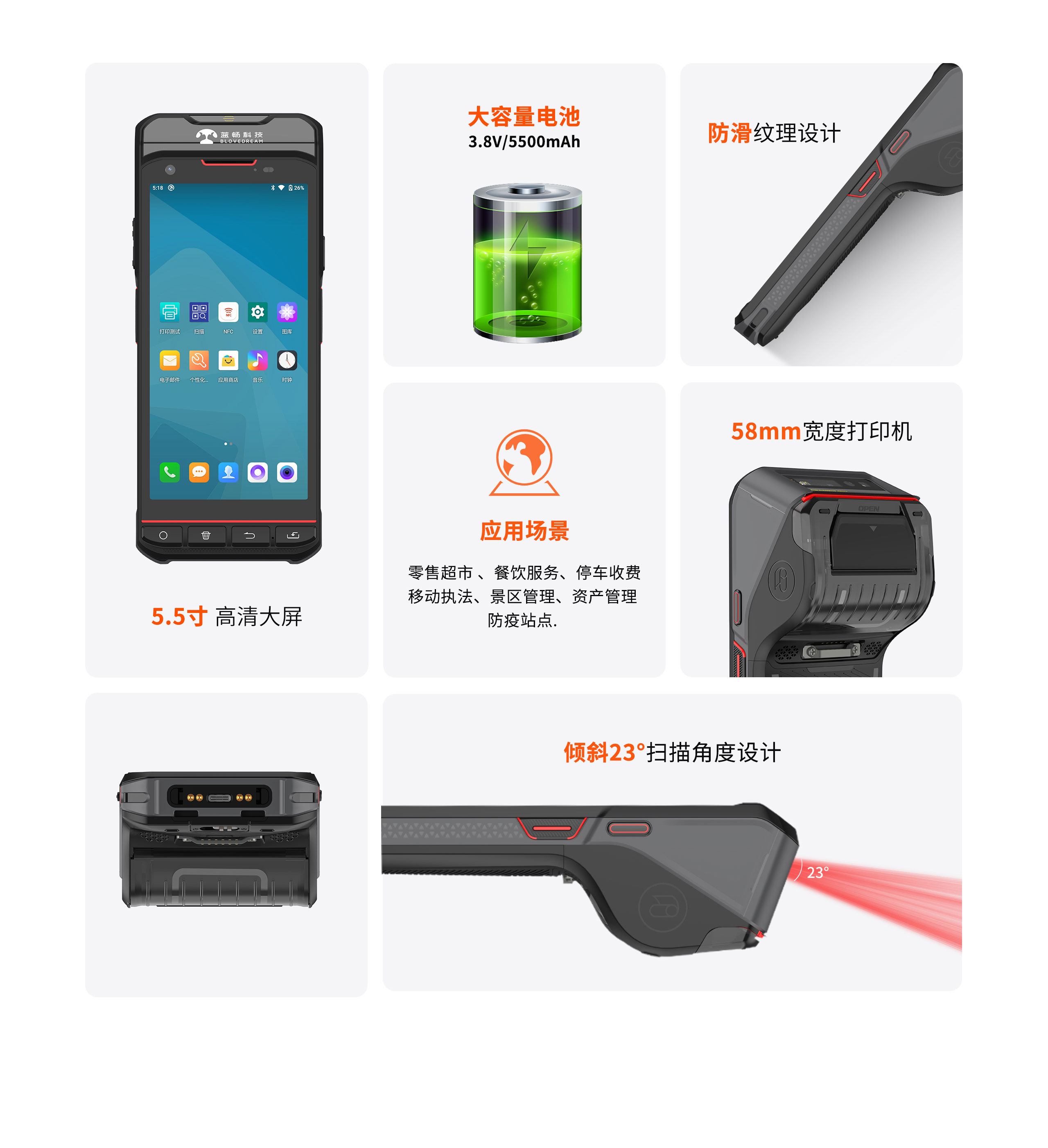 2.电池容量再升级,电池容量升级为5500mAh,打印与扫描条码随时切换,设备工作时长>12小时,为工作注入满满的动力。
